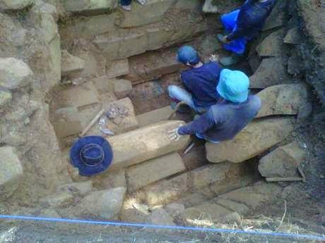 Las excavaciones y el estudio geoeléctrico han sido realizados por un grupo de investigadores indonesios. Hallaron unas columnas de andesita que se encuentran en posición horizontal alineada de este hacia oeste, que no es la condición natural, según el coordinador de investigadores, Danny H. Natawidjaja, del Instituto Indonesio de Ciencias (LIPI) perteneciente al Gobierno de Indonesia.