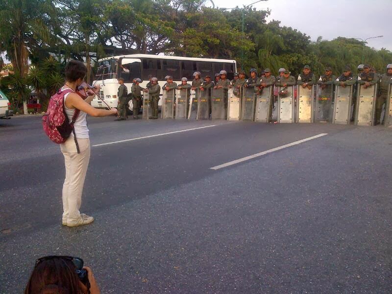 Con esa carajita que no pasa los 20 y le hace una gran puñeta a la tanqueta. Con esa que abraza al Guardia tratando de ablandarlo para que no le dispare. Con ese que le pinta una paloma con brazo tatuado de guerrero, como si la grosería derrumbara la escopeta. Con la que saca el violín y entona el “Gloria al bravo pueblo”, como si la Guardia la fuera a entender.