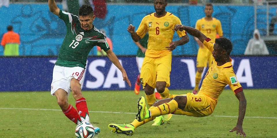 GOAL: Mexico’s No19 finds the back of the net after Itandje’s initial save, which he did well to get a hand on to begin win. The rebound prooved costly, however, and Peralta tucked it away to put El Tri in front.