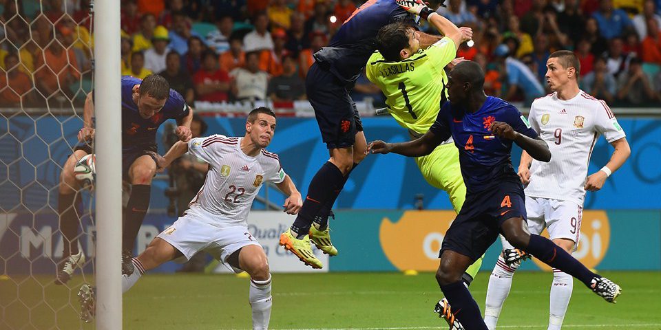 SALVADOR, BRAZIL – JUNE 13: Stefan de Vrij of the Netherlands deflects the ball in for the teams third goal as Iker Casillas of Spain and Robin van Persie of the Netherlands collide in the air during the 2014 FIFA World Cup Brazil Group B match between Spain and Netherlands at Arena Fonte Nova on June 13, 2014 in Salvador, Brazil. (Photo by David Ramos/Getty Images)