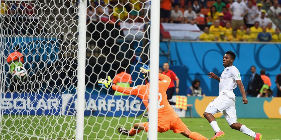 MANAUS, BRAZIL – JUNE 14: Daniel Sturridge of England shoots and scores his team’s first goal past Salvatore Sirigu of Italy during the 2014 FIFA World Cup Brazil Group D match between England and Italy at Arena Amazonia on June 14, 2014 in Manaus, Brazil. (Photo by Christopher Lee/Getty Images)