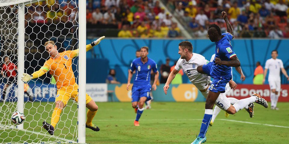 MANAUS, BRAZIL – JUNE 14: Mario Balotelli of Italy scores his team’s second goal on a header past Gary Cahill and goalkeeper Joe Hart of England during the 2014 FIFA World Cup Brazil Group D match between England and Italy at Arena Amazonia on June 14, 2014 in Manaus, Brazil. (Photo by Christopher Lee/Getty Images)