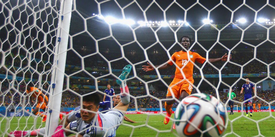 RECIFE, BRAZIL – JUNE 14: Gervinho of the Ivory Coast scores on a header past Eiji Kawashima of Japan as Wilfried Bony of the Ivory Coast looks on during the 2014 FIFA World Cup Brazil Group C match between the Ivory Coast and Japan at Arena Pernambuco on June 14, 2014 in Recife, Brazil. (Photo by Julian Finney/Getty Images)