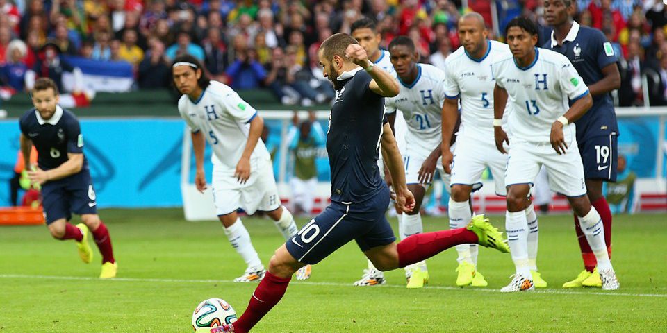 PORTO ALEGRE, BRAZIL – JUNE 15: Karim Benzema of France shoots and scores his team’s first goal on a penalty kick during the 2014 FIFA World Cup Brazil Group E match between France and Honduras at Estadio Beira-Rio on June 15, 2014 in Porto Alegre, Brazil. (Photo by Ian Walton/Getty Images)