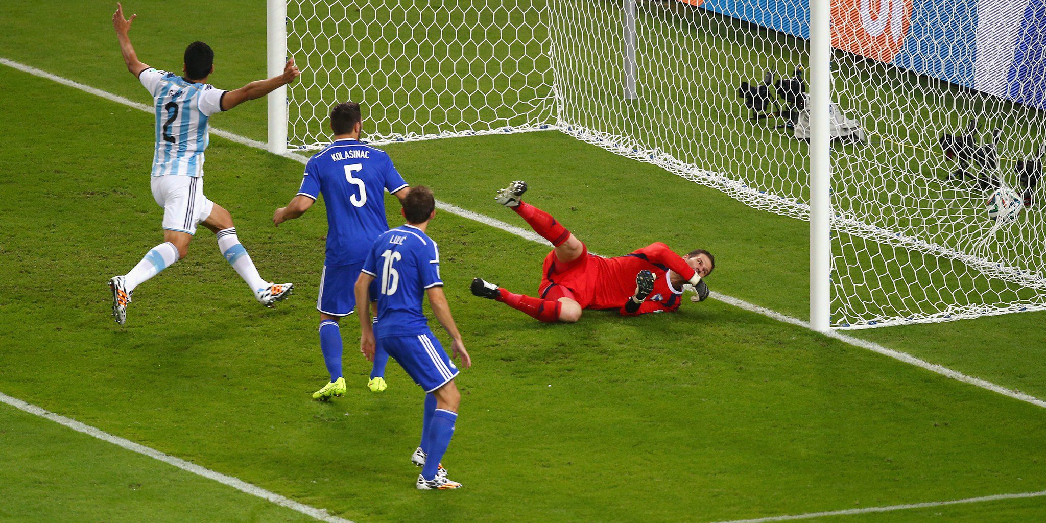 RIO DE JANEIRO, BRAZIL – JUNE 15: Sead Kolasinac of Bosnia and Herzegovina scores an own goal past goalkeeper Asmir Begovic as Ezequiel Garay of Argentina celebrates during the 2014 FIFA World Cup Brazil Group F match between Argentina and Bosnia-Herzegovina at Maracana on June 15, 2014 in Rio de Janeiro, Brazil. (Photo by Clive Rose/Getty Images)