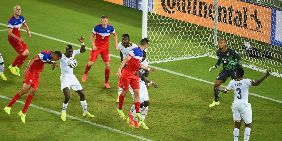 John Brooks of the United States scores his team’s second goal on a header past Adam Kwarasey of Ghana during the 2014 FIFA World Cup Brazil Group G match between Ghana and the United States at Estadio das Dunas on June 16, 2014 in Natal, Brazil. (Photo by Laurence Griffiths/Getty Images)