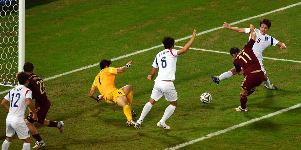 CUIABA, BRAZIL – JUNE 17: Aleksandr Kerzhakov of Russia shoots and scores his team’s first goal past goalkeeper Jung Sung-Ryong of South Korea during the 2014 FIFA World Cup Brazil Group H match between Russia and South Korea at Arena Pantanal on June 17, 2014 in Cuiaba, Brazil. (Photo by Christopher Lee/Getty Images)
