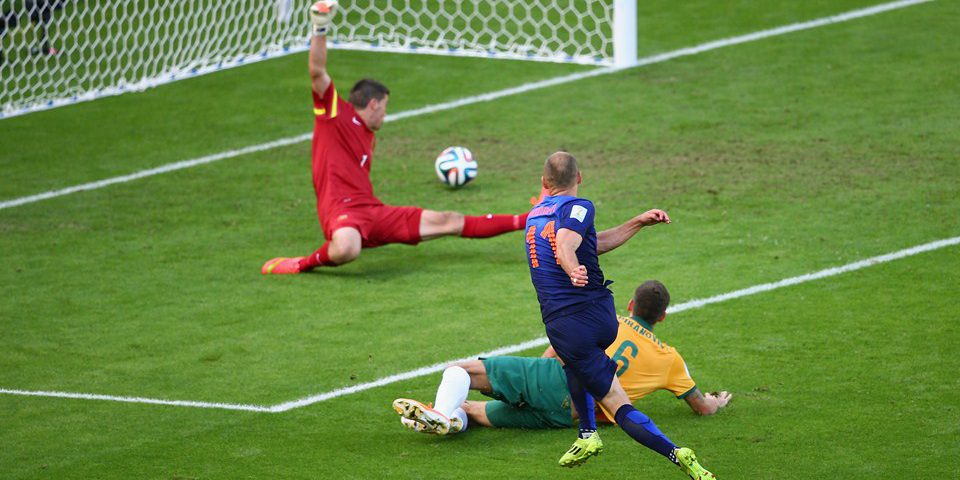 PORTO ALEGRE, BRAZIL – JUNE 18: Arjen Robben of the Netherlands shoots and scores his team’s first goal past goalkeeper Mathew Ryan of Australia during the 2014 FIFA World Cup Brazil Group B match between Australia and Netherlands at Estadio Beira-Rio on June 18, 2014 in Porto Alegre, Brazil. (Photo by Paul Gilham/Getty Images)