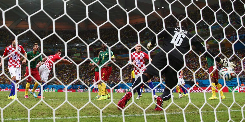 MANAUS, BRAZIL – JUNE 18: Mandzukic scores his team’s third goal on a header past Charles Itandje of Cameroon during the 2014 FIFA World Cup Brazil Group A match between Cameroon and Croatia at Arena Amazonia on June 18, 2014 in Manaus, Brazil. (Photo by Clive Brunskill/Getty Images)