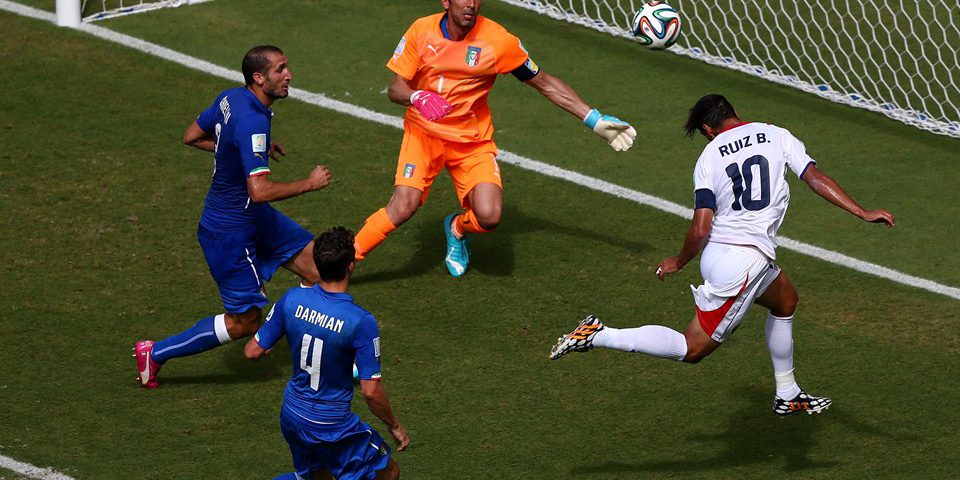 Bryan Ruiz of Costa Rica scores his team’s first goal past Gianluigi Buffon of Italy during the 2014 FIFA World Cup Brazil Group D match between Italy and Costa Rica at Arena Pernambuco on June 20, 2014 in Recife, Brazil. (Photo by Laurence Griffiths/Getty Images)