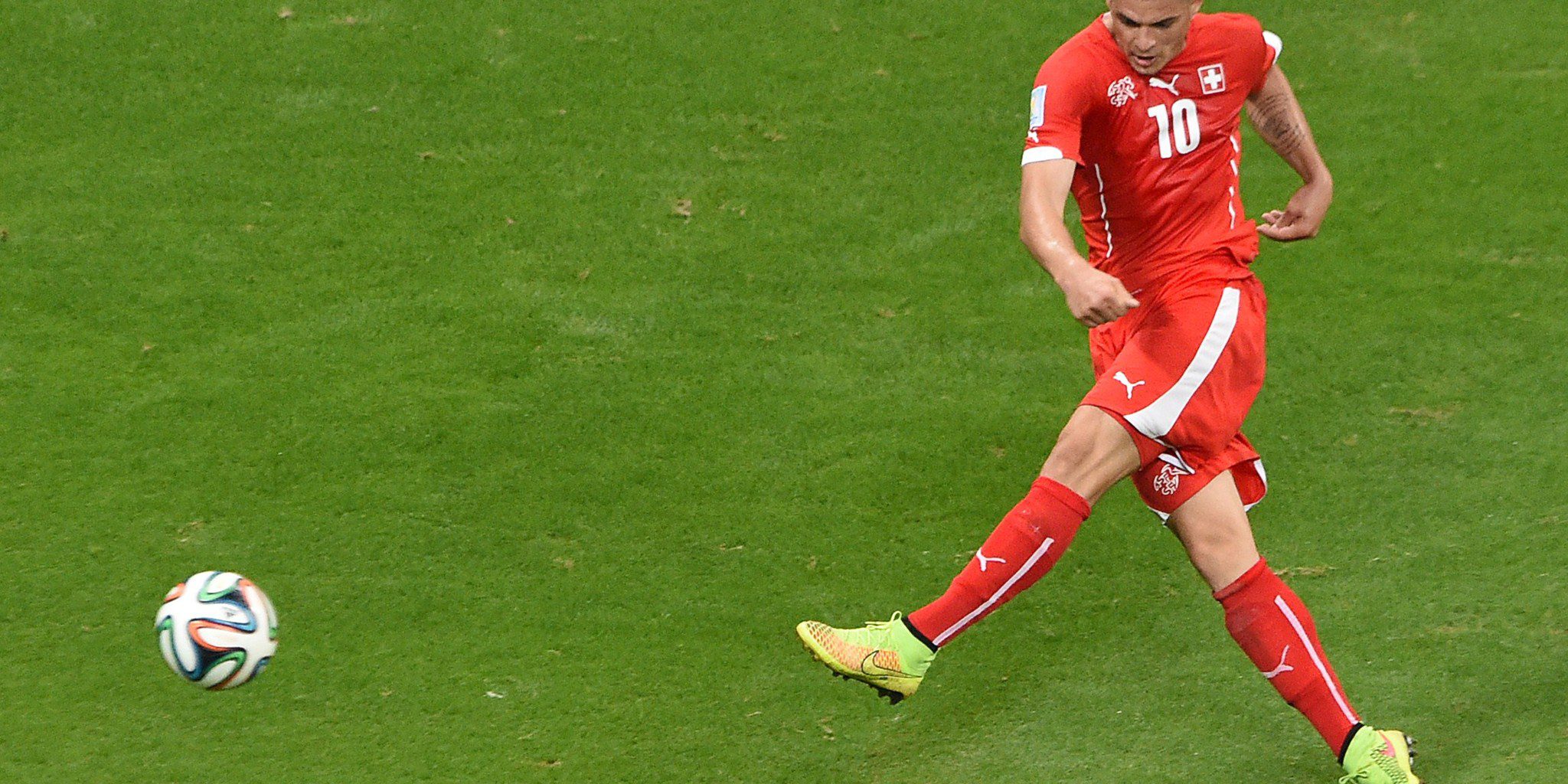 Switzerland’s midfielder Granit Xhaka scores during a Group E football match between Switzerland and France at the Fonte Nova Arena in Salvador during the 2014 FIFA World Cup on June 20, 2014. AFP PHOTO / DIMITAR DILKOFF