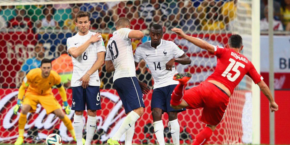 SALVADOR, BRAZIL – JUNE 20: Blerim Dzemaili of Switzerland shoots and scores his team’s first goal through a wall of Yohan Cabaye, Karim Benzema and Blaise Matuidi of France and past goalkeeper Hugo Lloris during the 2014 FIFA World Cup Brazil Group E match between Switzerland and France at Arena Fonte Nova on June 20, 2014 in Salvador, Brazil. (Photo by Adam Pretty/Getty Images)