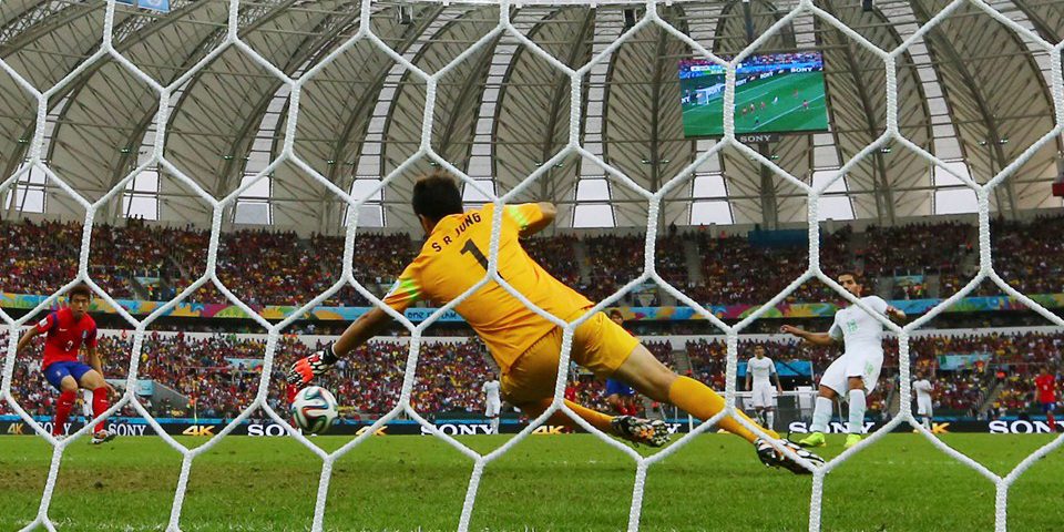 PORTO ALEGRE, BRAZIL – JUNE 22: Abdelmoumene Djabou of Algeria scores his team’s third goal past Jung Sung-Ryong of South Korea during the 2014 FIFA World Cup Brazil Group H match between South Korea and Algeria at Estadio Beira-Rio on June 22, 2014 in Porto Alegre, Brazil. (Photo by Quinn Rooney/Getty Images)