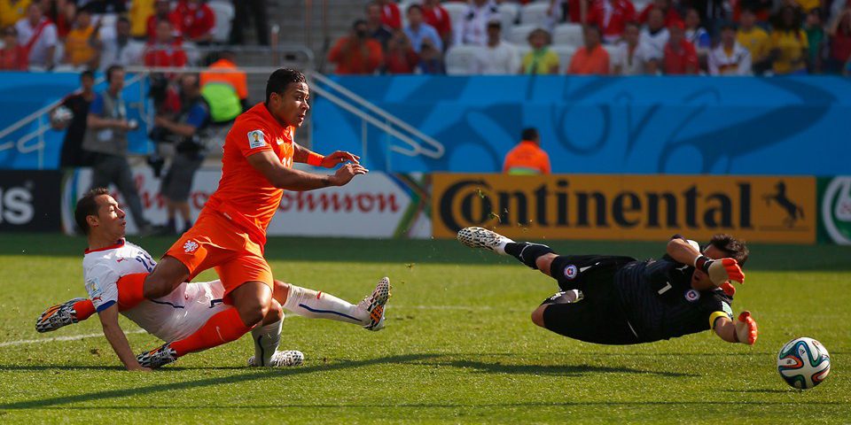 SAO PAULO, BRAZIL – JUNE 23: Memphis Depay of the Netherlands shoots and scores his team’s second goal past goalkeeper Claudio Bravo of Chile during the 2014 FIFA World Cup Brazil Group B match between the Netherlands and Chile at Arena de Sao Paulo on June 23, 2014 in Sao Paulo, Brazil. (Photo by Clive Rose/Getty Images)