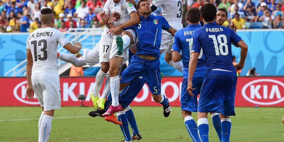NATAL, BRAZIL – JUNE 24: Diego Godin of Uruguay goes up for a header and scores his team’s first goal during the 2014 FIFA World Cup Brazil Group D match between Italy and Uruguay at Estadio das Dunas on June 24, 2014 in Natal, Brazil. (Photo by Matthias Hangst/Getty Images)