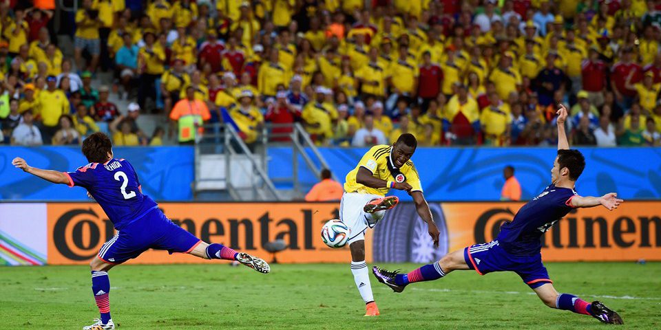 CUIABA, BRAZIL – JUNE 24: Jackson Martinez of Colombia shoots and scores his team’s third goal during the 2014 FIFA World Cup Brazil Group C match between Japan and Colombia at Arena Pantanal on June 24, 2014 in Cuiaba, Brazil. (Photo by Christopher Lee/Getty Images)