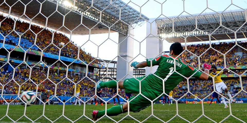 CUIABA, BRAZIL – JUNE 24: Juan Guillermo Cuadrado of Colombia scores his team’s first goal from the penalty spot past Eiji Kawashima of Japan during the 2014 FIFA World Cup Brazil Group C match between Japan and Colombia at Arena Pantanal on June 24, 2014 in Cuiaba, Brazil. (Photo by Dennis Grombkowski – FIFA/FIFA via Getty Images)
