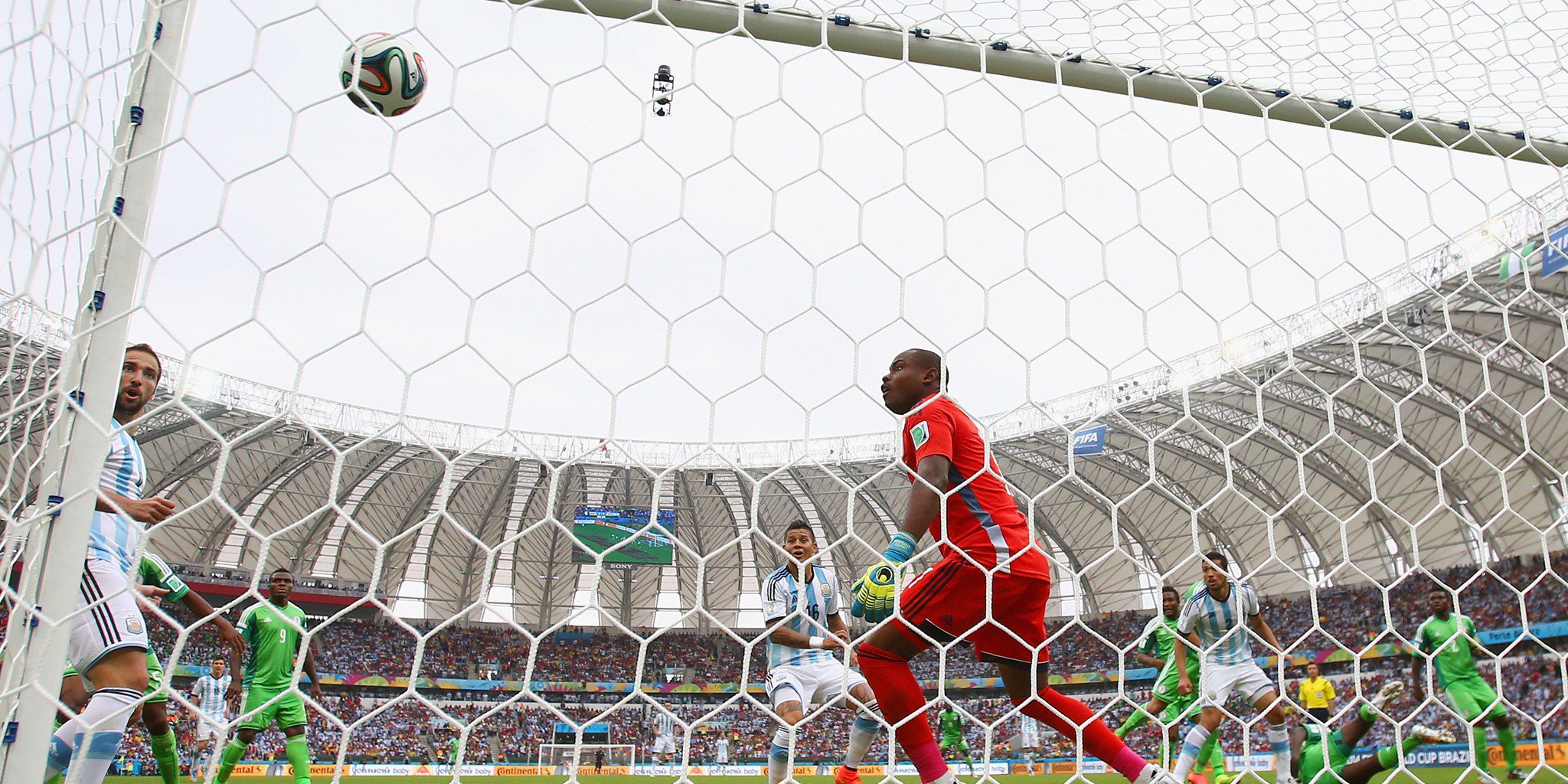 PORTO ALEGRE, BRAZIL – JUNE 25: Marcos Rojo of Argentina scores his team’s third goal past Vincent Enyeama of Nigeria during the 2014 FIFA World Cup Brazil Group F match between Nigeria and Argentina at Estadio Beira-Rio on June 25, 2014 in Porto Alegre, Brazil. (Photo by Ronald Martinez/Getty Images)