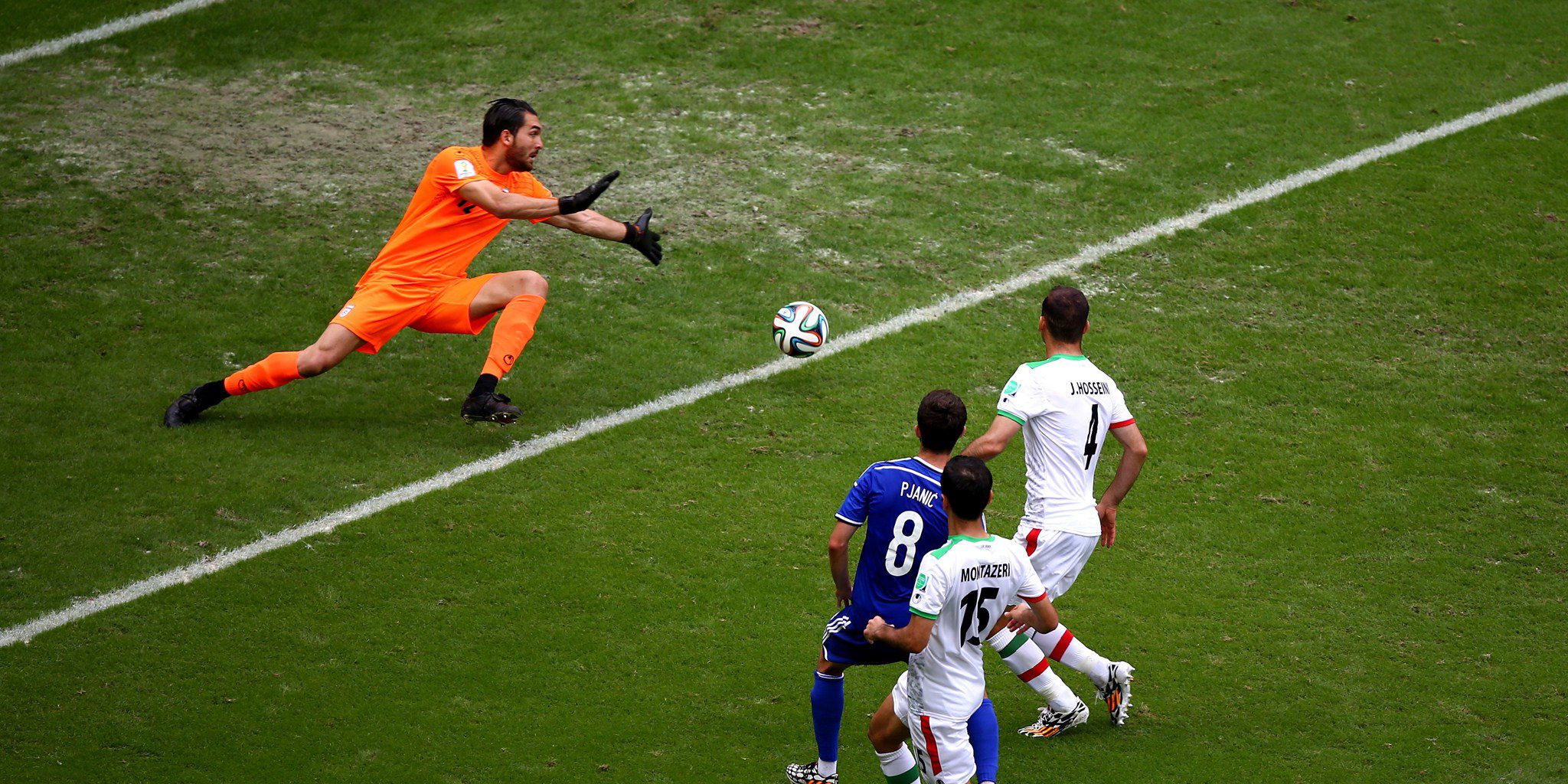 SALVADOR, BRAZIL – JUNE 25: Miralem Pjanic of Bosnia and Herzegovina shoots and scores his team’s second goal past goalkeeper Alireza Haghighi of Iran during the 2014 FIFA World Cup Brazil Group F match between Bosnia and Herzegovina and Iran at Arena Fonte Nova on June 25, 2014 in Salvador, Brazil. (Photo by Michael Steele/Getty Images)