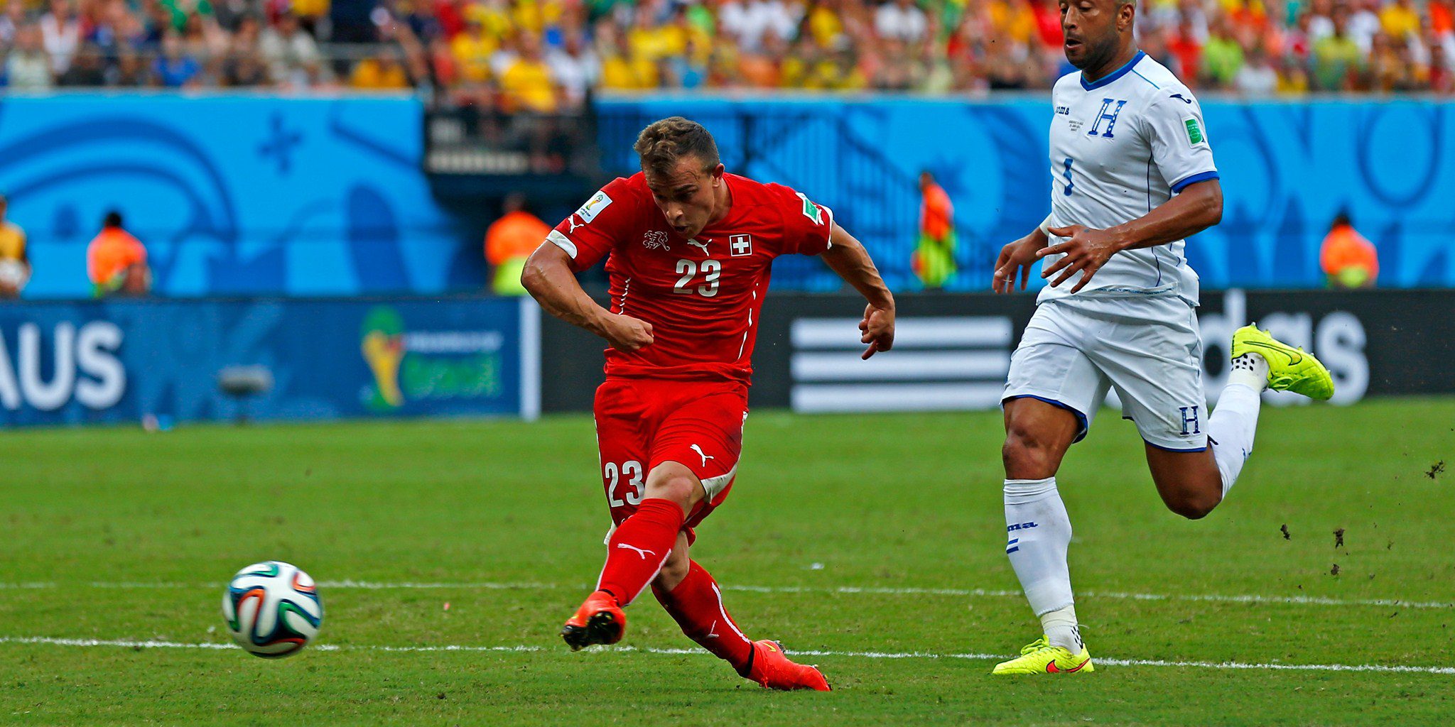 MANAUS, BRAZIL – JUNE 25: Xherdan Shaqiri of Switzerland shoots and scores his team’s second goal during the 2014 FIFA World Cup Brazil Group E match between Honduras and Switzerland at Arena Amazonia on June 25, 2014 in Manaus, Brazil. (Photo by Matthew Lewis/Getty Images)