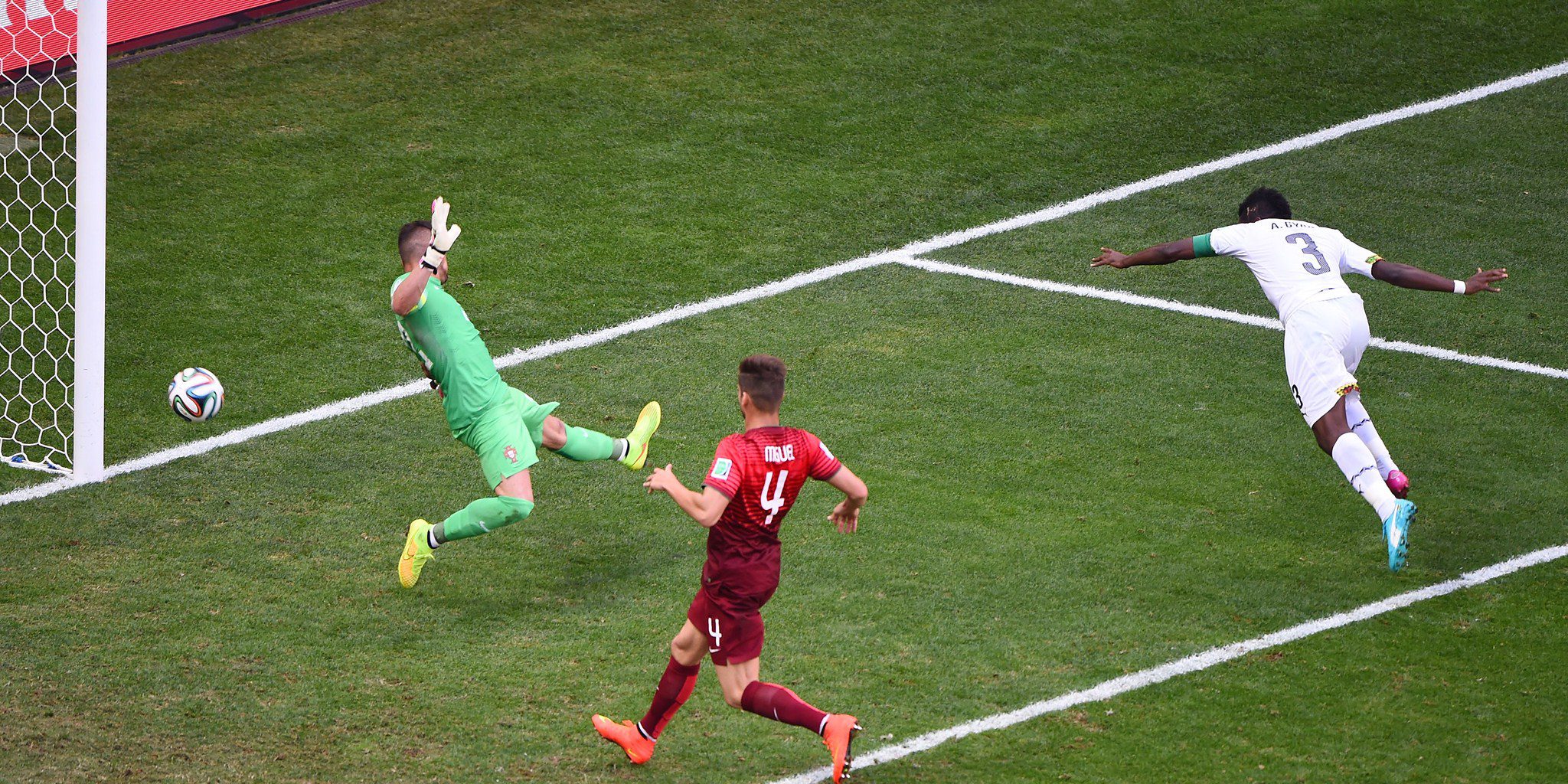 BRASILIA, BRAZIL – JUNE 26: Asamoah Gyan of Ghana scores his team’s first goal past goalkeeper Beto of Portugal during the 2014 FIFA World Cup Brazil Group G match between Portugal and Ghana at Estadio Nacional on June 26, 2014 in Brasilia, Brazil. (Photo by Christopher Lee/Getty Images)