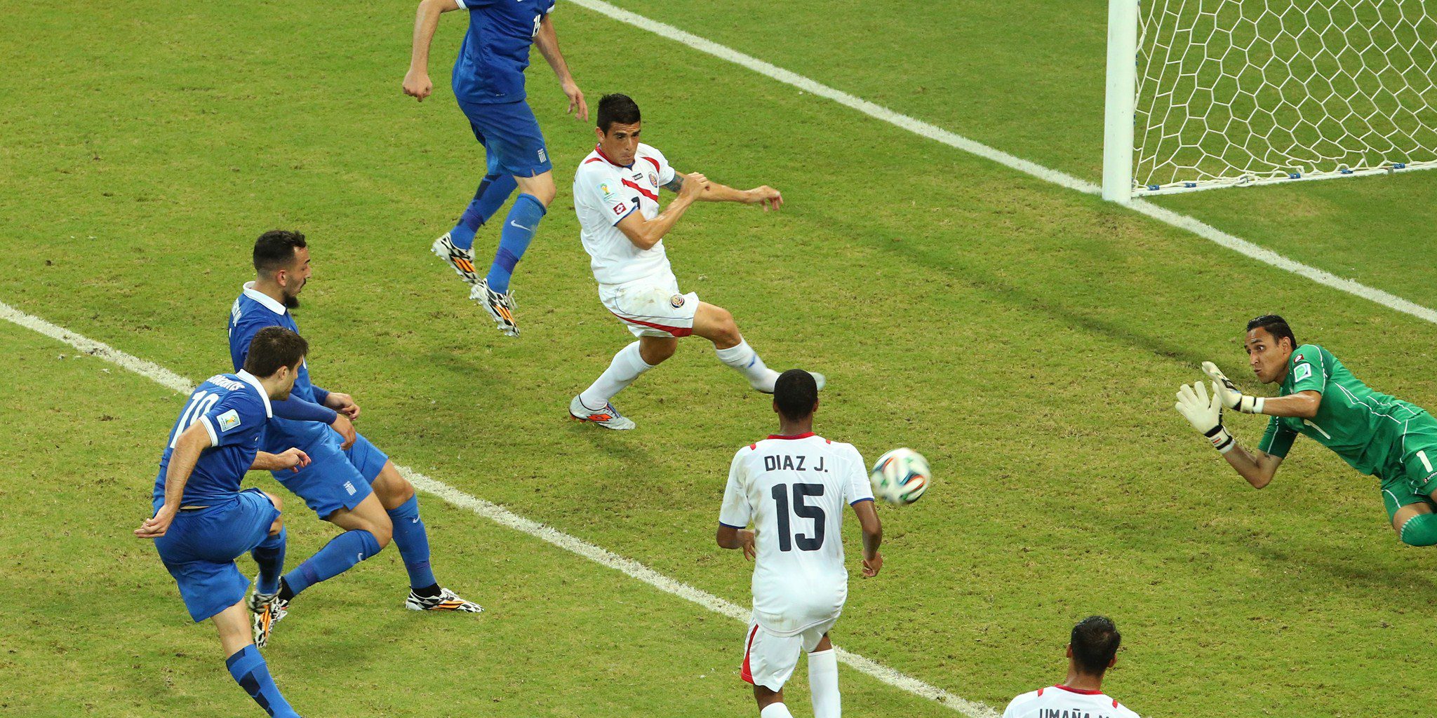 RECIFE, BRAZIL – JUNE 29: Sokratis Papastathopoulos of Greece (L) shoots and scores his team’s first goal past goalkeeper Keylor Navas of Costa Rica during the 2014 FIFA World Cup Brazil Round of 16 match between Costa Rica and Greece at Arena Pernambuco on June 29, 2014 in Recife, Brazil. (Photo by Renato Spencer/Getty Images)