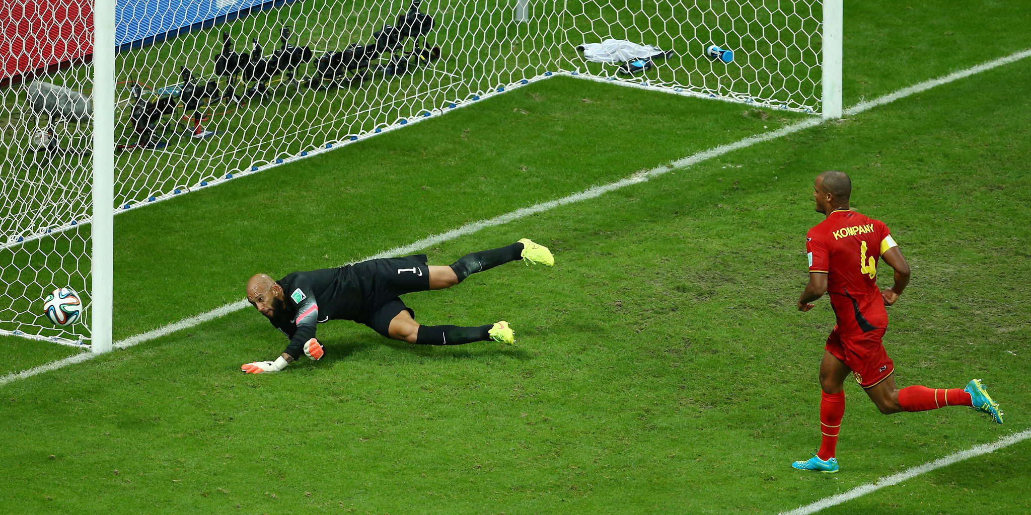 Vincent Kompany of Belgium has his shot saved by Tim Howard of the United States