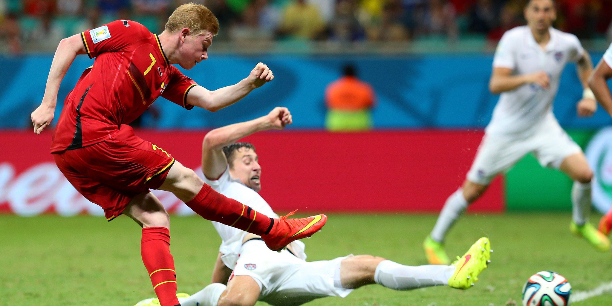 SALVADOR, BRAZIL – JULY 01: Kevin De Bruyne of Belgium scores his team’s first goal during the 2014 FIFA World Cup Brazil Round of 16 match between Belgium and USA at Arena Fonte Nova on July 1, 2014 in Salvador, Brazil. (Photo by Alex Livesey – FIFA/FIFA via Getty Images)