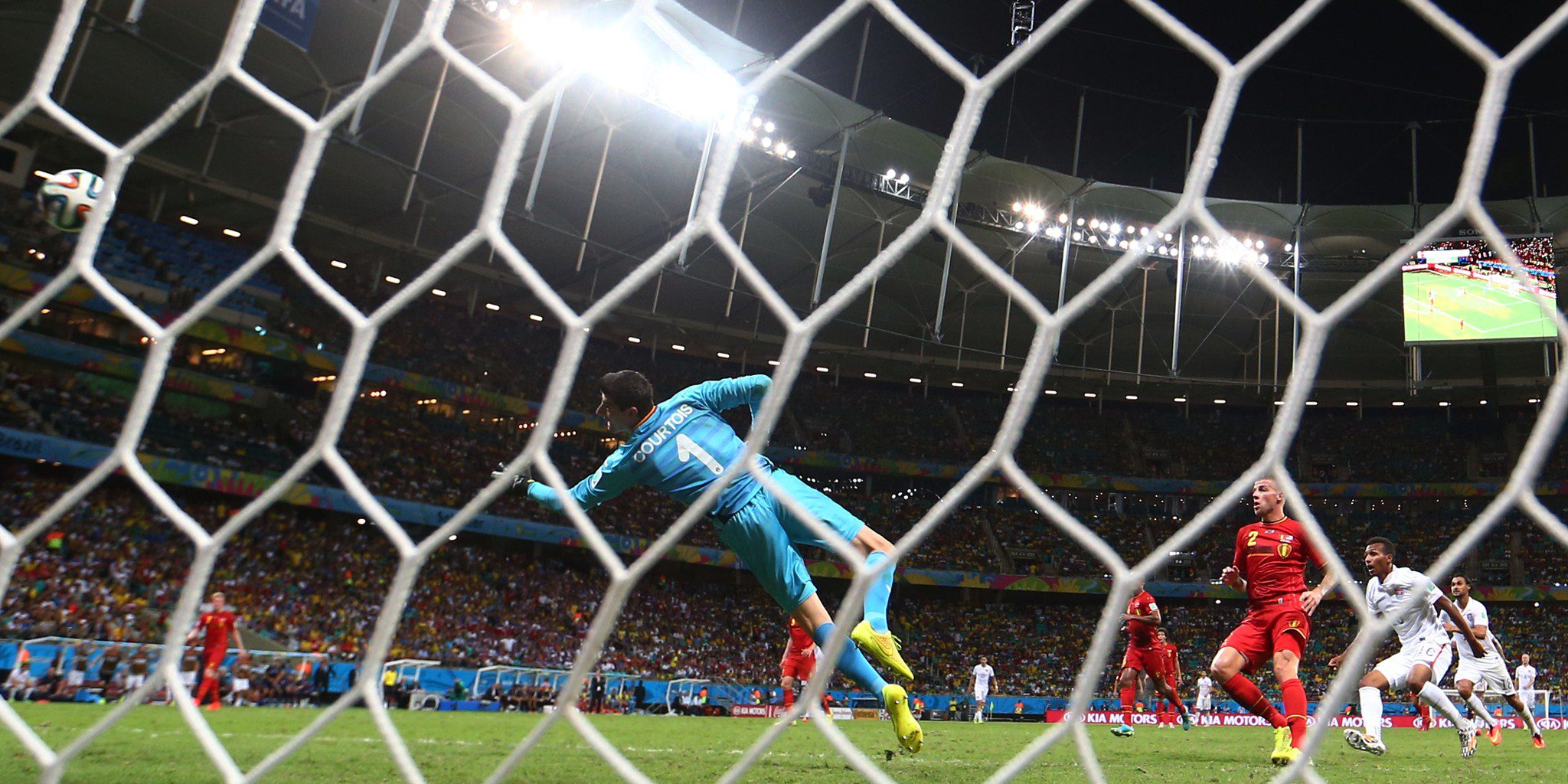 SALVADOR, BRAZIL – JULY 01: Julian Green of the United States scores his team’s first goal past Thibaut Courtois of Belgium in extra time during the 2014 FIFA World Cup Brazil Round of 16 match between Belgium and the United States at Arena Fonte Nova on July 1, 2014 in Salvador, Brazil. (Photo by Michael Steele/Getty Images)