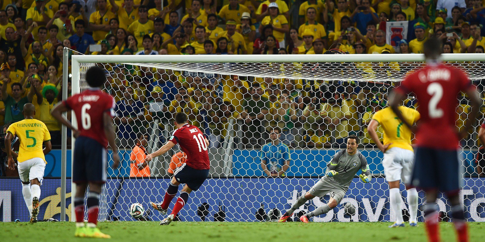 FORTALEZA, BRAZIL – JULY 04: James Rodriguez of Colombia shoots and scores his team’s first goal on a penalty kick past Julio Cesar of Brazil during the 2014 FIFA World Cup Brazil Quarter Final match between Brazil and Colombia at Castelao on July 4, 2014 in Fortaleza, Brazil. (Photo by Laurence Griffiths/Getty Images)