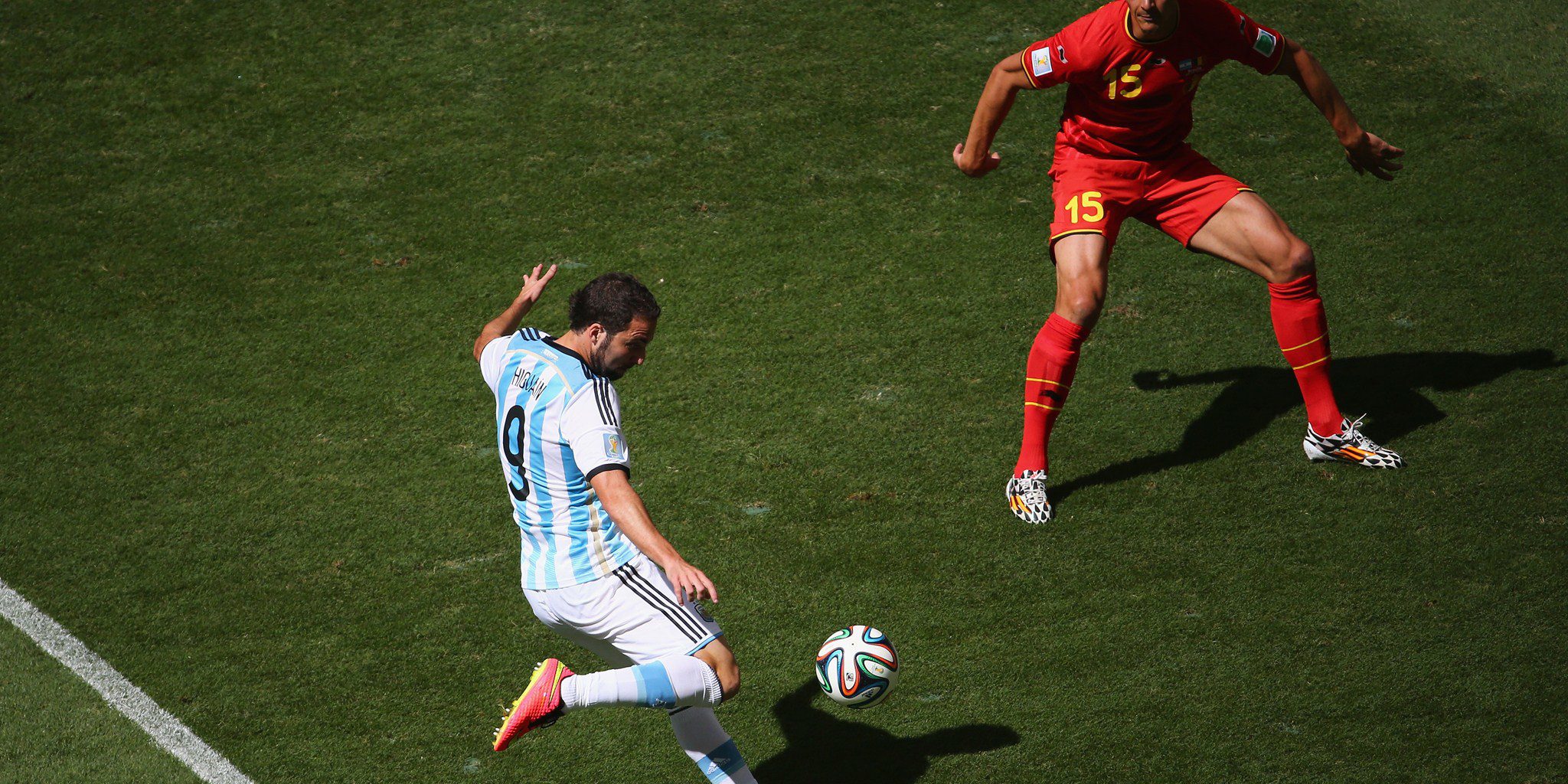 Gonzalo Higuain of Argentina scores his team’s first goal against Daniel Van Buyten of Belgium during the 2014 FIFA World Cup Brazil Quarter Final match between Argentina and Belgium at Estadio Nacional on July 5, 2014 in Brasilia, Brazil. (Photo by Jamie Squire/Getty Images)