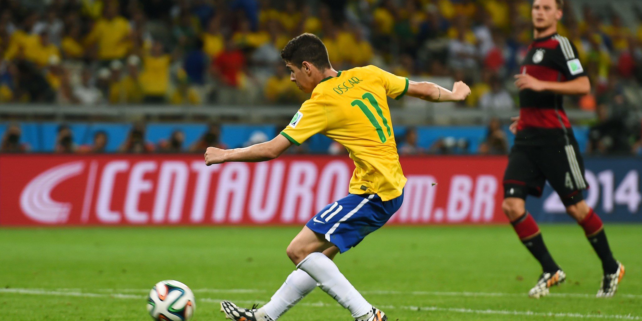 BELO HORIZONTE, BRAZIL – JULY 08: Oscar of Brazil shoots and scores his team’s first goal during the 2014 FIFA World Cup Brazil Semi Final match between Brazil and Germany at Estadio Mineirao on July 8, 2014 in Belo Horizonte, Brazil. (Photo by Buda Mendes/Getty Images)
