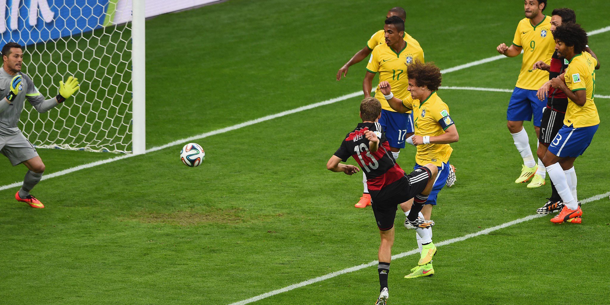 BELO HORIZONTE, BRAZIL – JULY 08: Thomas Mueller of Germany scores his team’s first goal past David Luiz and goalkeeper Julio Cesar of Brazil during the 2014 FIFA World Cup Brazil Semi Final match between Brazil and Germany at Estadio Mineirao on July 8, 2014 in Belo Horizonte, Brazil. (Photo by Jamie McDonald/Getty Images)