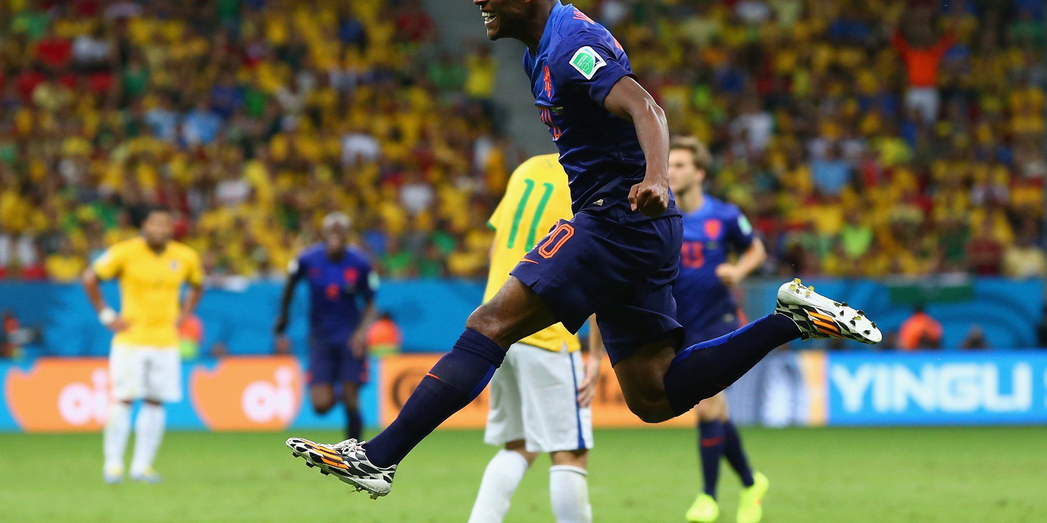 BRASILIA, BRAZIL – JULY 12: Georginio Wijnaldum of the Netherlands celebrates scoring his team’s third goal during the 2014 FIFA World Cup Brazil Third Place Playoff match between Brazil and the Netherlands at Estadio Nacional on July 12, 2014 in Brasilia, Brazil. (Photo by Robert Cianflone/Getty Images)
