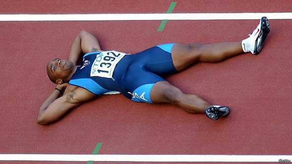 En el momento y frente a 72.000 aficionados Drummond se sentó, y luego se acostó, sobre la pista del estadio Saint-Dennis en los Mundiales de Atletismo en Francia 2003.