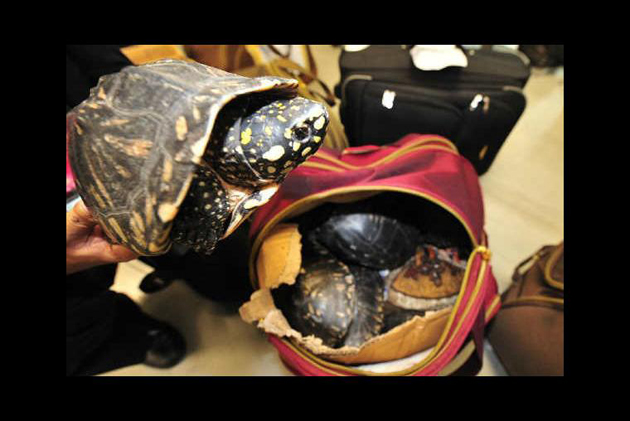 415 animales con un precio de 22 millones de pesos, ese fue el cargamento que dos hombres traían en su equipaje. 300 tortugas estrelladas, 90 tortugas de triple quilla y 25 tortugas Pangshura tecta era lo que este hombre quería traficar en el mercado negro.