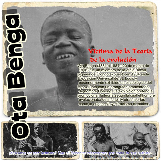 Los teóricos del evolucionismo, para confirmar sus hipótesis empezaron a buscar fósiles de ancestros humanos por todo el mundo. Algunos evolucionistas creían que en la actualidad existían criaturas “semimonos- semihumanas” que fueran el eslabón perdido. Esto fue motivo de muchos actos de crueldad como el que involucró al pigmeo Ota Benga, quien fue capturado en el Congo en 1904 por el investigador evolucionista Samuel Verner.