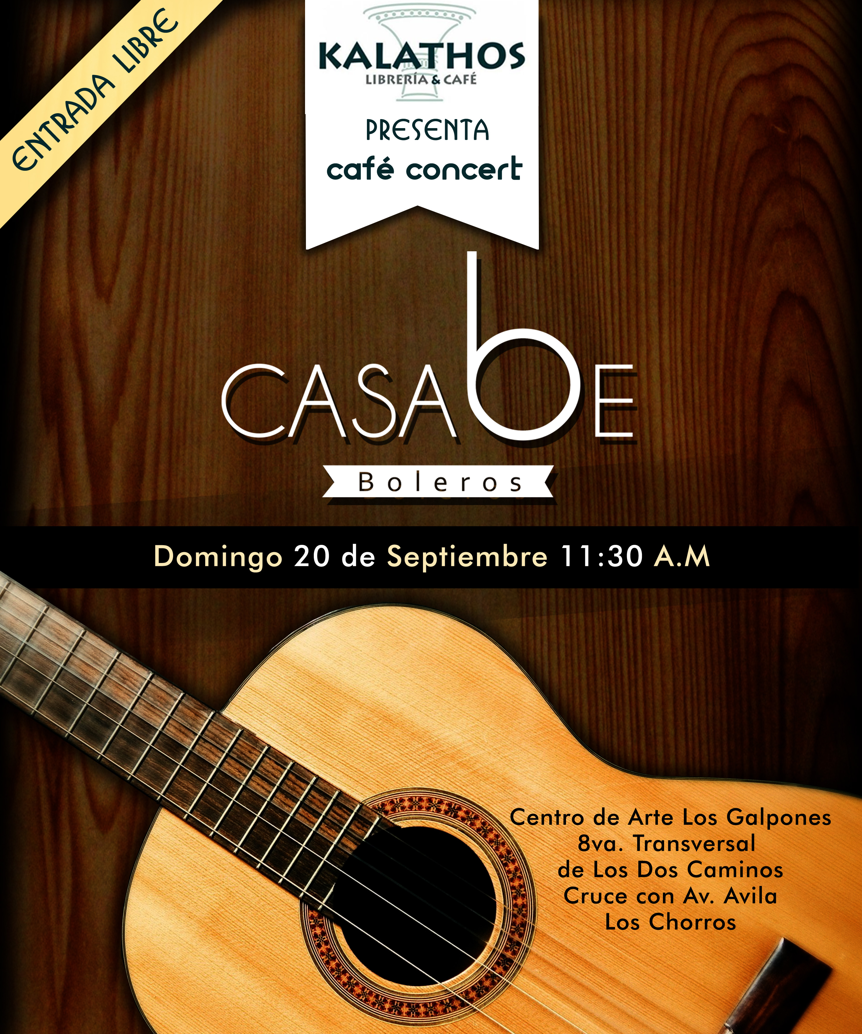 La cita del Café Concert de Boleros con el Grupo Casabe será en la librería Kalathos, este próximo domingo 20 de septiembre a las 11:30am, en el Centro de Arte Los Galpones, 8va transversal con Avenida Ávila. Los Chorros. Caracas.
