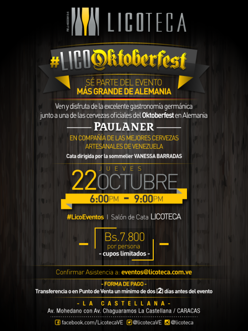 LICOTECA ha querido sumarse a esta celebración con su propio LicoOktoberfest y ha invitado a la sommelier Vanessa Barradas a seleccionar las más populares cervezas artesanales del país para dirigir una cata junta a la cerveza alemana. Será un evento dinámico y a la vez didáctico donde se conocerán y catarán tres estilos de cervezas: tres tipos de la cerveza industrial alemana Paulaner, una de la microcervecería Tovar y las cervezas artesanales elaboradas por homebrewers: Cask y Birra Capital; acompañadas por bocadillos típicos que nos llevarán a disfrutar de los sabores de la gastronomía germánica.