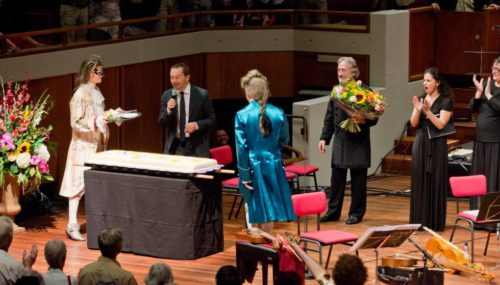 Venecia, sin embargo, salió un tanto malparada, pues apenas se escucharon músicas de verdadera enjundia. La excepción fue el Combattimento di Tancredi e Clorinda de Monteverdi, una sustancial obra maestra que casi rechinaba en medio de tantas pequeñas grageas, pero que conoció una versión inane. Voces e instrumentos fueron amplificados por primera vez en esta semana, lo que magnificó las carencias de aquellas. En el intermedio, el entusiasta público, jaleado por el director del festival, cantó al músico el Cumpleaños feliz por sus recientes 75 años y luego se repartieron gratuitamente 1.800 porciones de tarta con la inscripción “Savall 75”. El milenario recorrido musical, a trechos tedioso, concluyó con varios arreglos del catalán y llegó hasta Mozart y Beethoven. ¡Quién iba a decirle a Philippe Pierlot que acabaría tocando un día con su viola da gamba fragmentos de la Quinta y la Séptima Sinfonías del alemán!