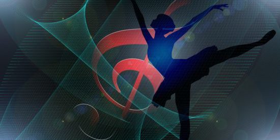 Una danza entrelazada con la geometría en un escenario inspirado en hojas de papel cuadriculado con ornamentación barroca.
