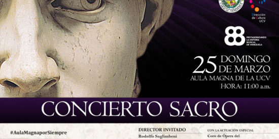 La Orquesta Sinfónica de Venezuela, Patrimonio Artístico de la Nación, en el marco de sus 88 años de fundada, presentará el domingo 25 de marzo a las 11.00 a.m., en el Aula Magna, de la Universidad Central de Venezuela, un “Concierto Sacro”, el cual contará con la dirección del maestro Rodolfo Saglimbeni y la destacada actuación de los solistas Eleonora Troncone (Soprano), Luis Gabriel Cabrera (Tenor), Melba González (Mezzo), Álvaro Carrillo (Bajo), con la actuación especial del Coro de Ópera del Teatro Teresa Carreño.