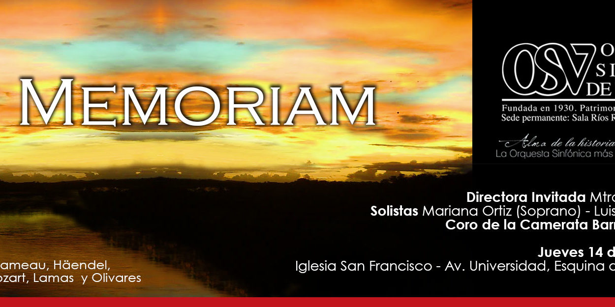 Bajo la batuta de la Maestra Isabel Palacios, la Orquesta Sinfónica de Venezuela y el coro de la Camerata Barroca de Caracas, ofrecen este jueves 14 de marzo a las 5 p.m. en las instalaciones de la Iglesia de San Francisco (ubicada en la Esquina de San Francisco de la Av. Universidad) el concierto In Memoriam, con la participación de los solistas: la soprano Mariana Ortiz y el tenor Luis Cabrera.