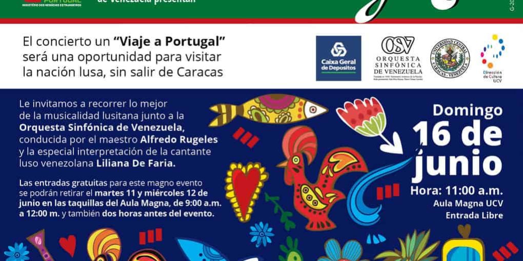 La cita es el domingo 16 de junio, a las 11 a.m., en el Aula Magna de la Universidad Central de Venezuela, cuando Portugal conmemorará su día presentando este concierto titulado un “Viaje a Portugal”, con la Orquesta Sinfónica de Venezuela bajo la conducción del maestro Alfredo Rugeles y las interpretaciones de la cantante luso venezolana Liliana De Faria. La entrada será libre y el evento es posible gracias a la Embajada de Portugal en Caracas y el Instituto Camões – Instituto da Cooperação e da Língua, con el patrocinio de Caixa Geral de Depósitos y la cooperación de la Dirección de Cultura de la UCV.