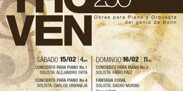 La Escuela de Música Mozarteum Caracas, La Asociación Cultural Humboldt, y La Orquesta Sinfónica Municipal de Caracas invitan al evento “Gran Maratón Musical Beethoven 250 Aniversario” en conmemoración de los 250 años del nacimiento de Ludwig van Beethoven. El evento contará con la participación como solistas de los profesores de la Escuela Mozarteum Caracas, el Maestro Arnaldo Pizzolante, el Maestro Carlos Urbaneja Silva y tres de sus más destacados alumnos: Lina Marea, Alejandro Orta y Fabio Páez, y el Maestro Sadao Muraki, Presidente de la Orquesta Sinfónica Municipal de Caracas, todos dirigidos por el Maestro Rodolfo Saglimbeni.