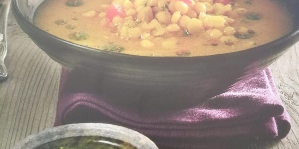 Caliente 2 cucharadas de aceite en una cazuela y rehogue el comino y los granos de mostaza. Agregue la cebolla, el ajo, el jengibre y la guindilla, y deje que todo se dore ligeramente. Vierta el caldo.