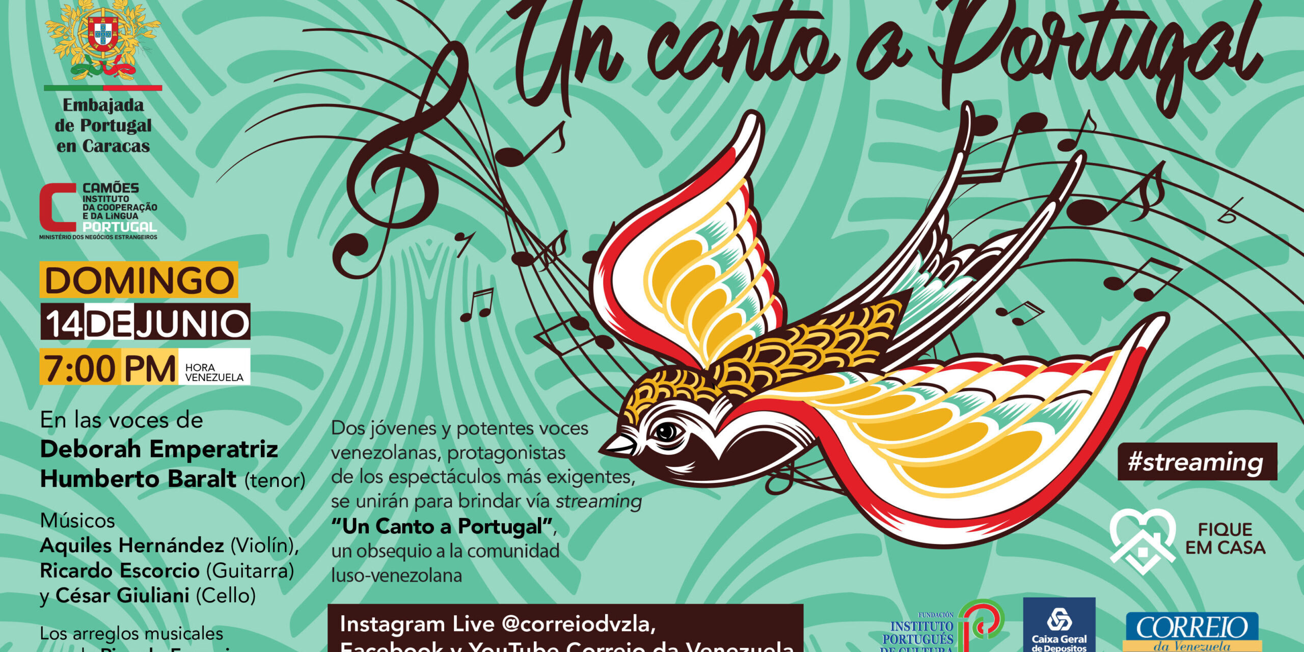 Es por ello que, en esta ocasión, el concierto “Un Canto a Portugal” se transmitirá por redes sociales el domingo 14 de junio, a las 7:00 p.m., gracias a los esfuerzos del equipo organizador integrado por la Embajada de Portugal en Caracas, el Instituto Camões – Instituto da Cooperação e da Língua, con el patrocinio de Caixa Geral de Depósitos, el Instituto Portugués de Cultura (IPC) y el Correio da Venezuela.