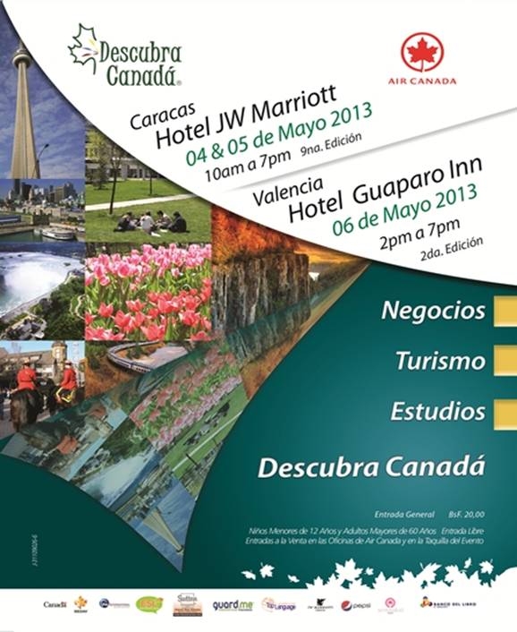 El próximo sábado 04 y domingo 05 de mayo de 2013 todos los empresarios, estudiantes, operadores de turismo y público en general, tienen una cita con Descubra Canadá® evento organizado por Business Aviation & Services S.A (BASSA) y sus patrocinantes: AIR CANADA, SEDAV, PRI INTERNATIONAL, ENJOY SECOND LANGUAGE, SUTTON GROUP-FLAVIO DOS SANTOS, GUARD.ME, y TOP LANGUAGE, que invitan a visitar la novena edición de la feria Descubra Canadá®, en el Hotel J.W. Marriott Caracas a partir de las 10:00 a.m. hasta las 7:00 p.m. y el lunes 06 de mayo en el Hotel Guaparo Inn en Valencia, a partir de las 2:00 p.m. hasta las 7:00 p.m.