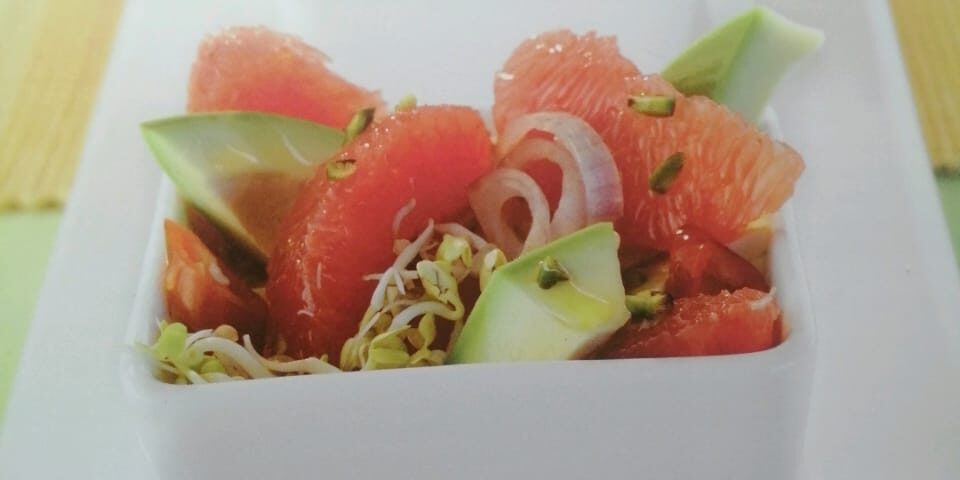 Prepare un aliño mezclando el vinagre con el jugo del pomelo, sal, pimienta y el aceite.