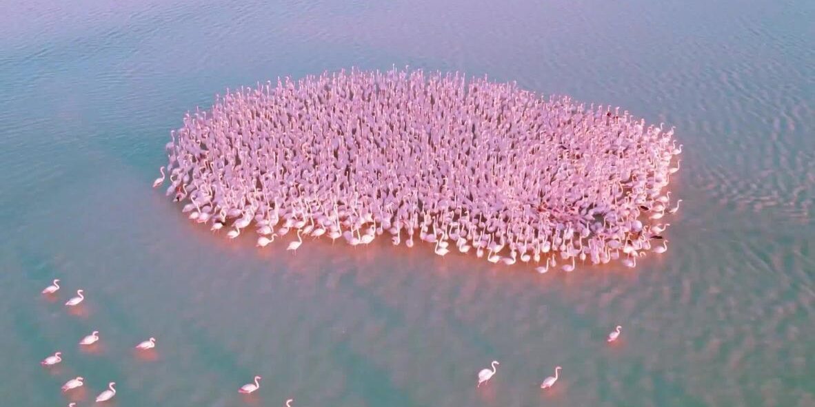 Cientos de flamencos rosas descansan en el lago Karakol, cerca de Aktau, en Kazajstán, adonde empezaron a llegar desde el pasado mes de octubre.